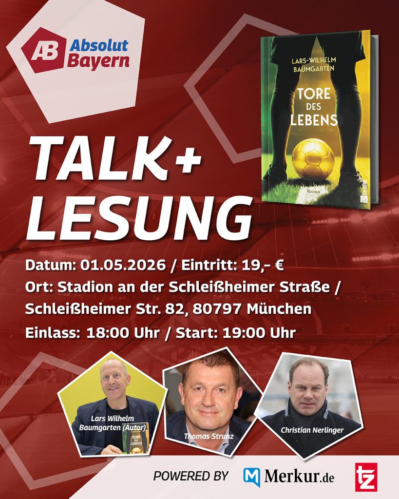 19.00 Uhr, Talk und Lesung „Tore des Lebens“ mit Christian Nerlinger, Thomas Strunz und Autor Lars-Wilhelm Baumgarten (powered by TZ und Merkur)